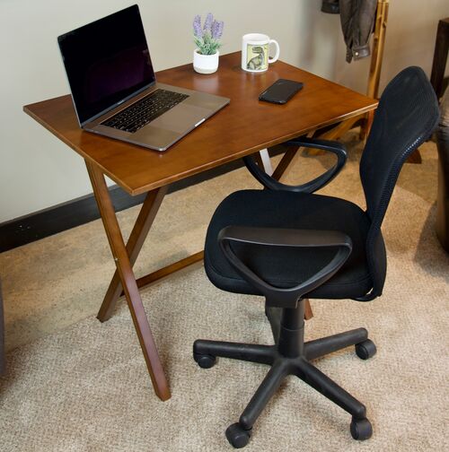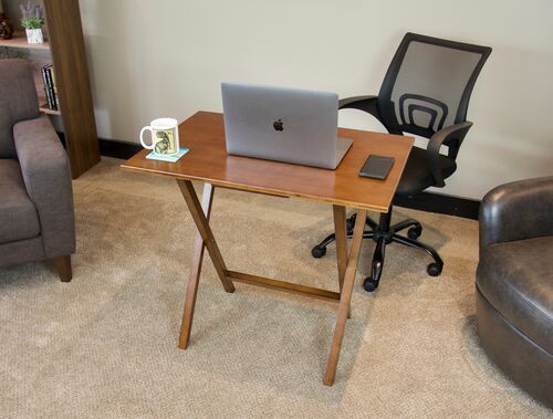 This solid bamboo frame folding desk is the perfect solution for any small workspace. Roomy enough to fit your laptop, papers, accessories, phone, even a sewing or crafting project. Expertly crafted from environmentally friendly bamboo, this portable surface folds flat and can be stored away when no longer in use, granting a positive impact for the environment and your room. Conveniently locks into position when in use, giving a strong stable workspace. Featuring soft rounded edges, and a contemporary urban design, this piece is scaled for small spaces.