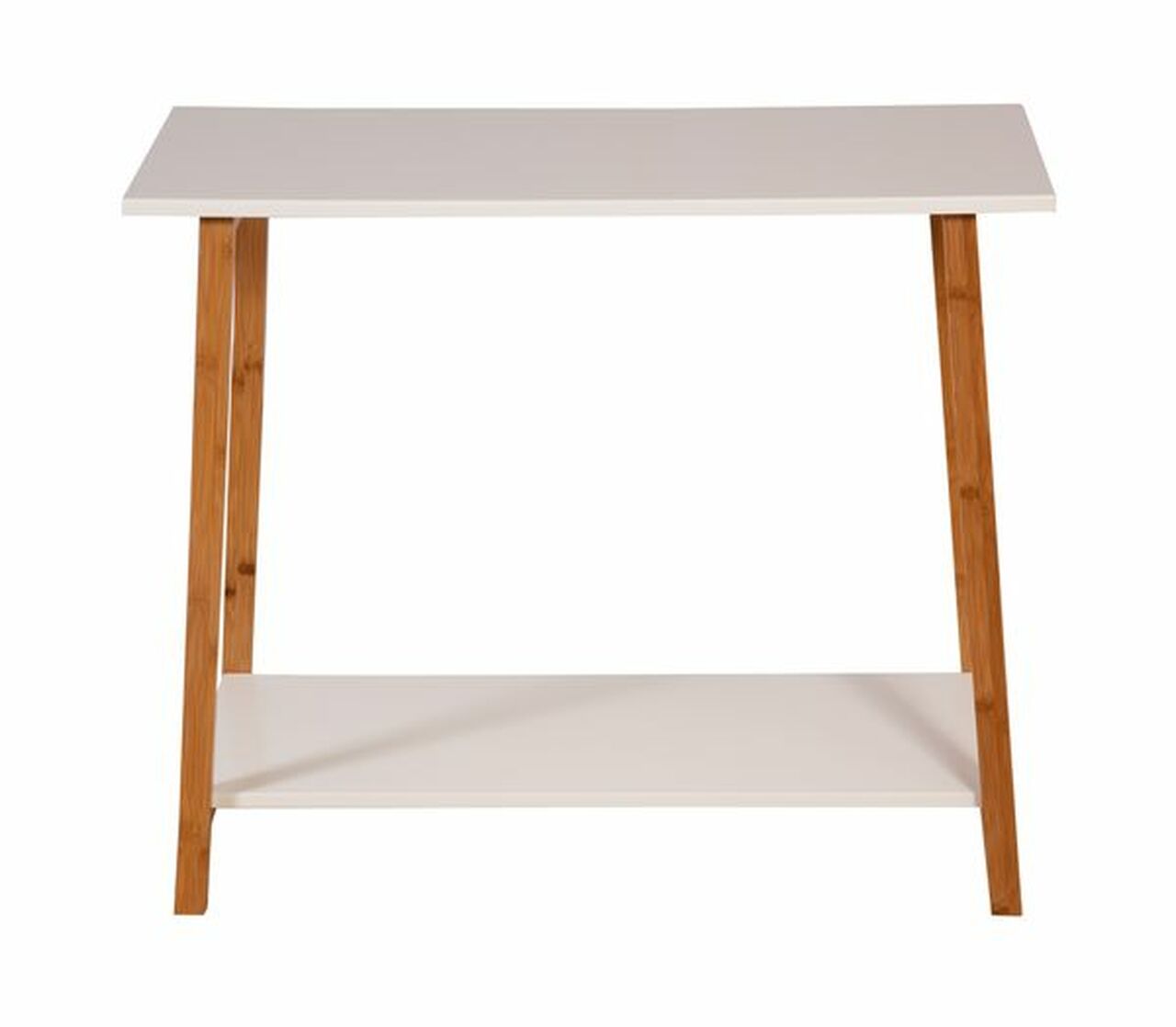 Contemporary simplicity with a hint of mid-century modern makes this environmentally friendly console table a must have for any room. Crafted from bamboo, its frame showcases an angled look that gives it unique eye-catching appeal. The top and lower shelf are crafted from manufactured wood, and comes in a solid finish, so as not to clash with your existing color scheme. This table combines simple elegance, beautiful design, and a green sustainability story to make a perfect fit for your home, and a positive impact for the planet. After assembly, this product supports 150 lbs.