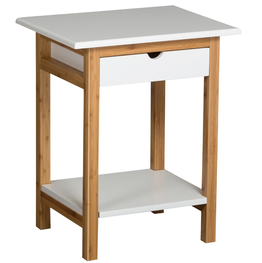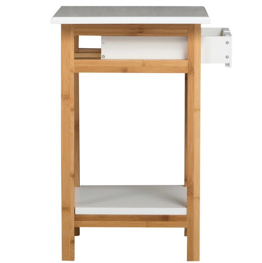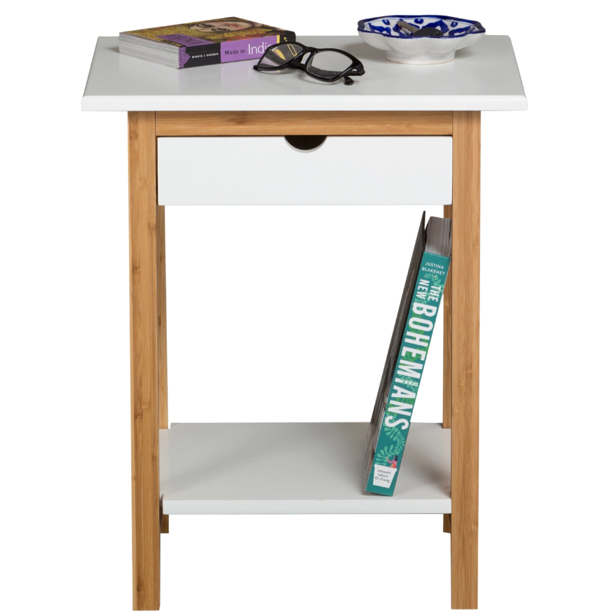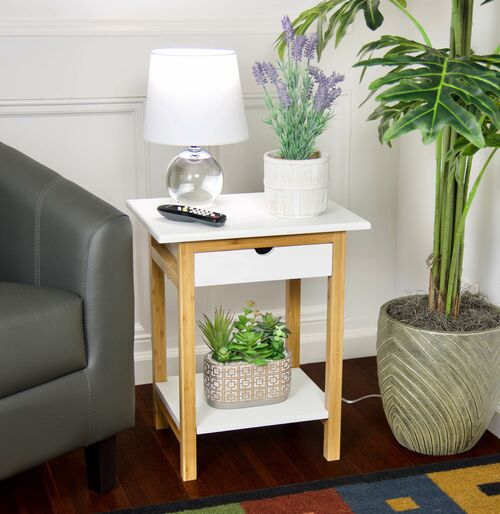 Simple elegance. Modern feel. Contemporary design. Complement your living area with this eye-catching lightweight and durable end table. Its frame, crafted from ecologically friendly bamboo, has steel reinforced corners and will support 100 lbs. Its square top comes in a solid matte finish, so as not to clash with your existing color scheme. This table combines a beautiful design, maximizing space with a drawer and lower shelf. The eco-friendly bamboo creates a green sustainability story making a positive impact for the planet.