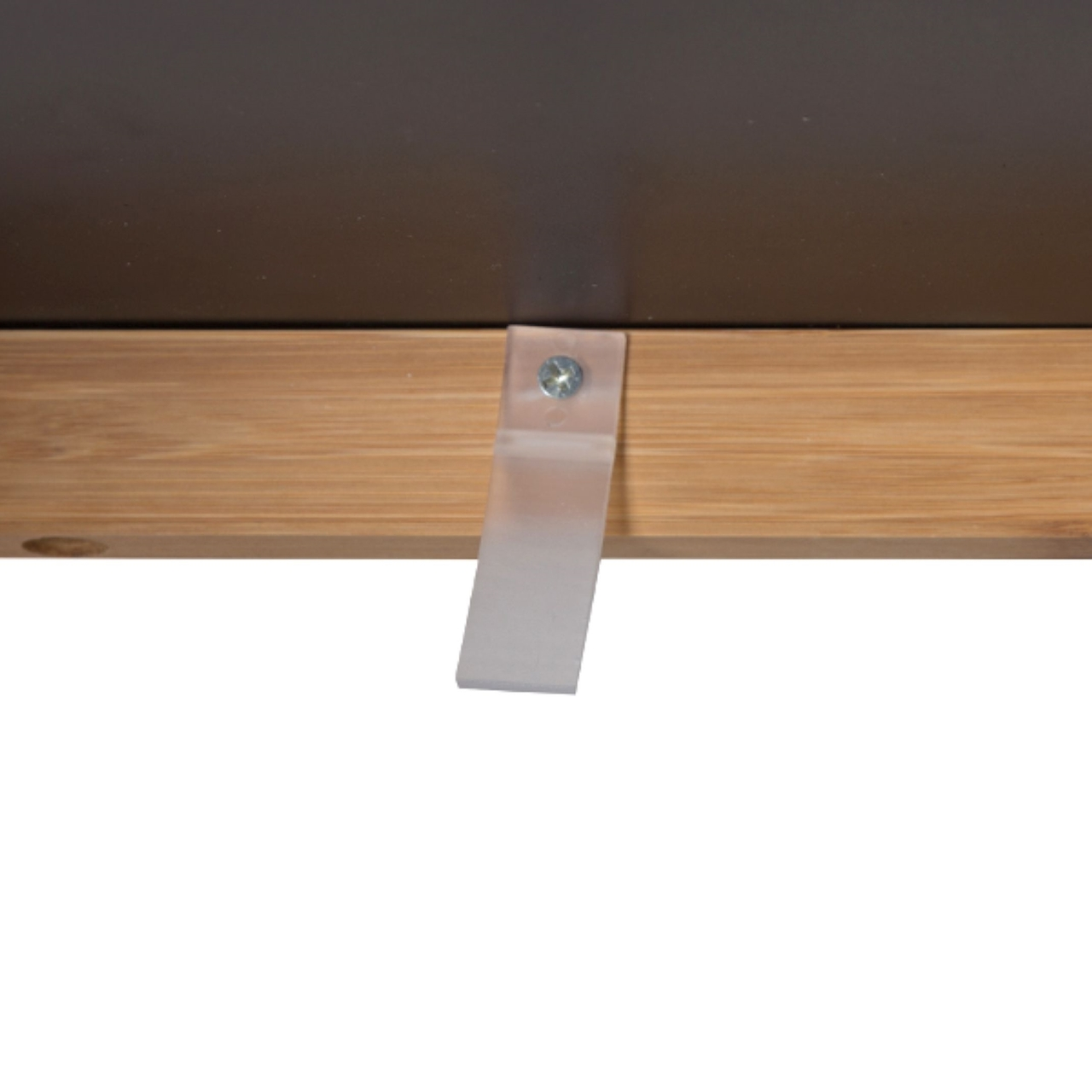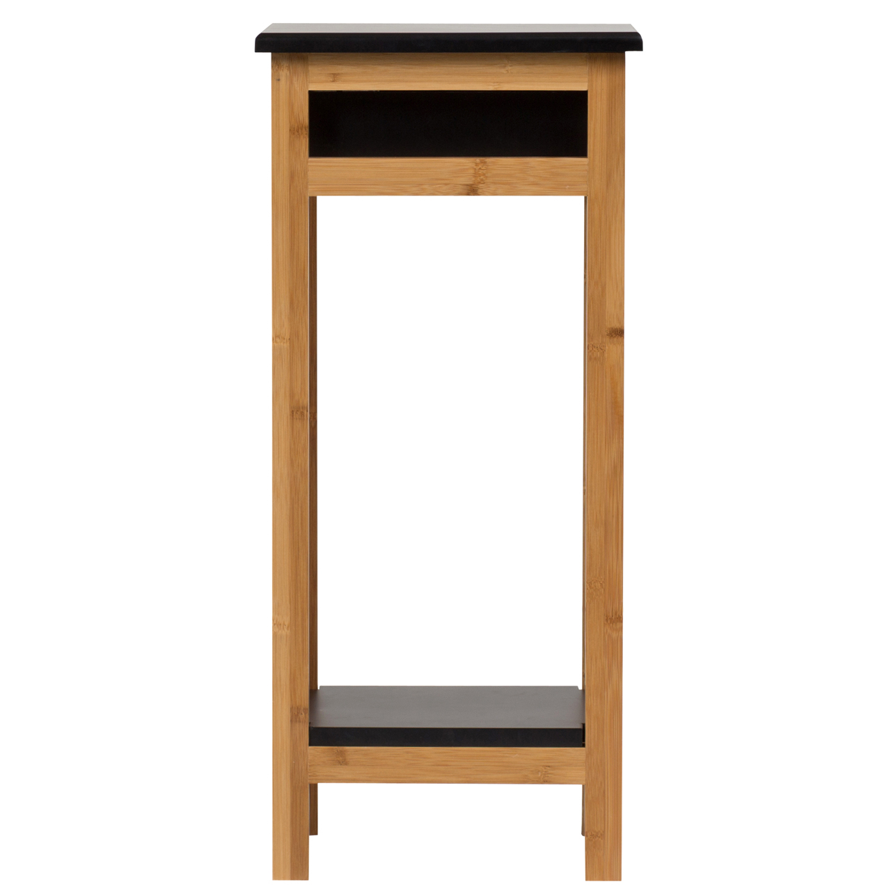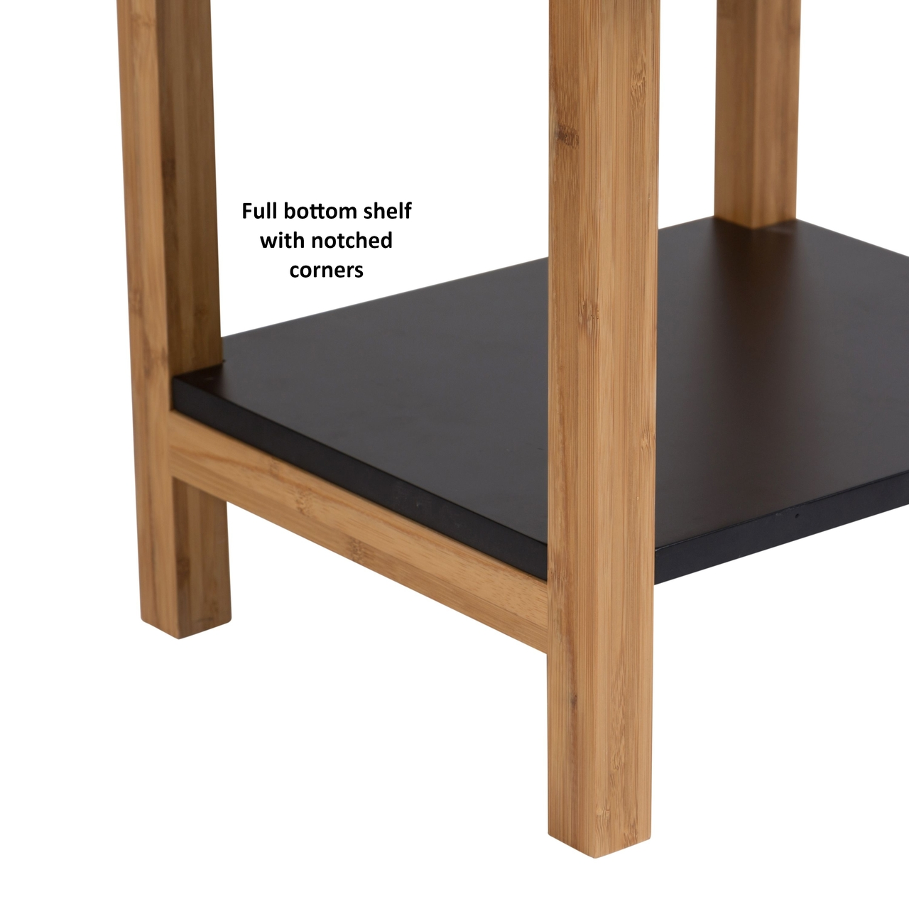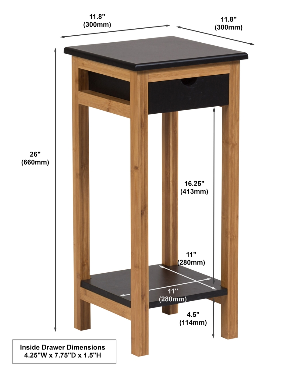 This stylish versatile table can fit into tight areas to utilize small spaces. With a sturdy bamboo frame and steel reinforced corners this table will support 100 lbs. As an ideal accent table or night stand, it is lightweight and durable. With a drawer and lower shelf, storage is maximized.