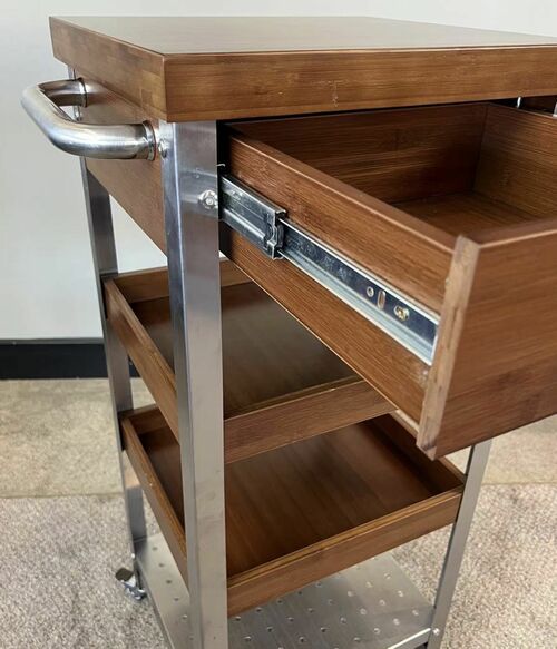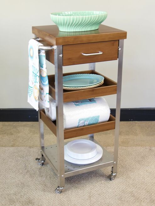 Expand your workspace while keeping your cookware, kitchenware, barware, snacks, and beverages close at hand with the Eccostyle Bamboo & Stainless Steel Kitchen Cart Tower in caramel finish. This rolling kitchen preparation cart has a nicely sized countertop measuring 16"W x 14.5"D crafted from solid bamboo and is supported by a rust-freestainless steel framework. With 2 bamboo trays and a stainless shelf, each supporting 40 lbs., there is ample space for storing essentials. Durable 360-degree rotating industrial casters make for easy mobility around corners and into tight places. Two locking wheels enable stability at all times. Includes a single pull-outstorage drawer and side push handle that doubles as a towel bar. Multifunctional and ideal for small spaces.