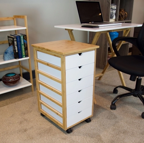 The bamboo frame 6-Drawer Rolling Cart features 6 removable drawers. With ample space, organizational purposes are endless with this rolling storage cart. The solid bamboo frame is sturdy and eco-friendly, and rests on top of 4, 360-degree rotational casters that allow for easy mobility and lock into place.