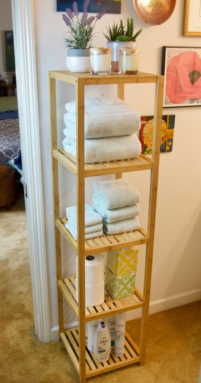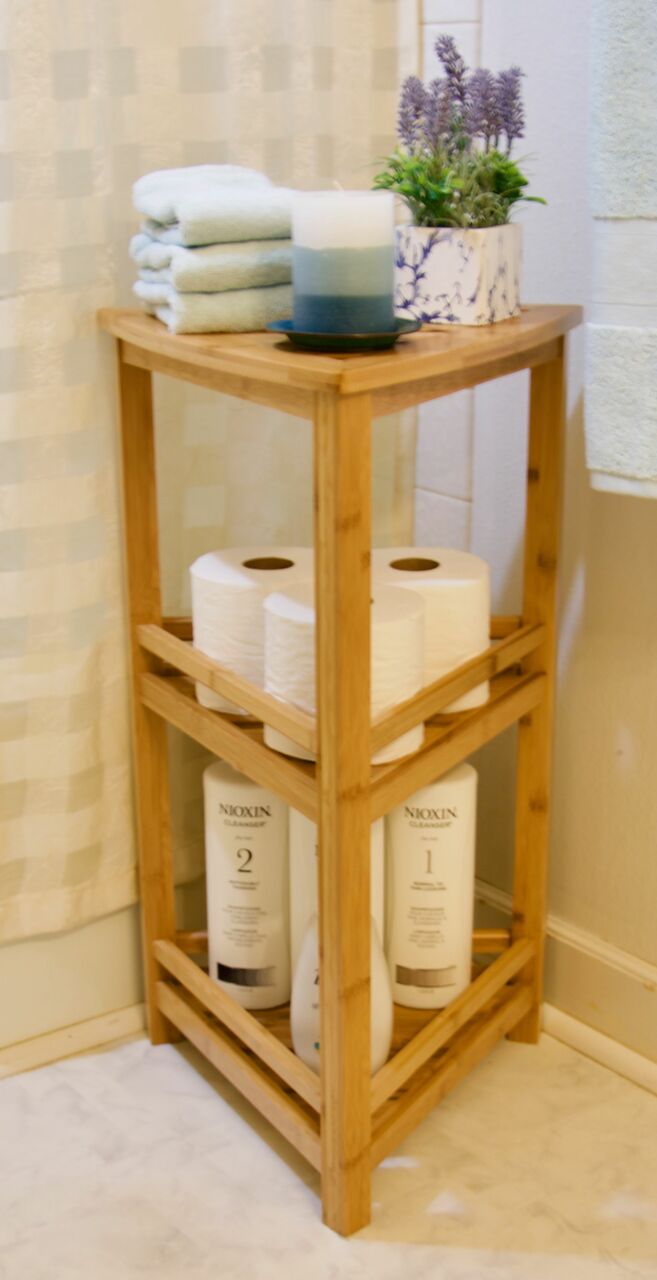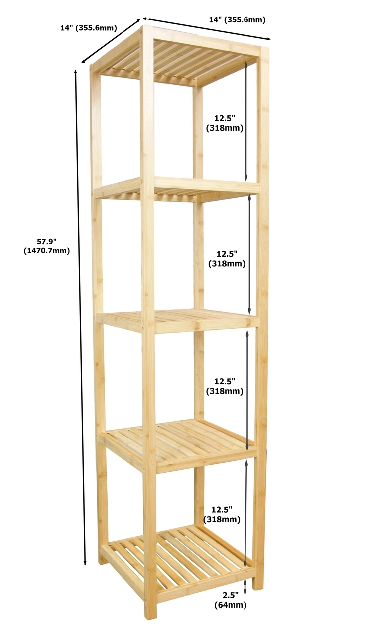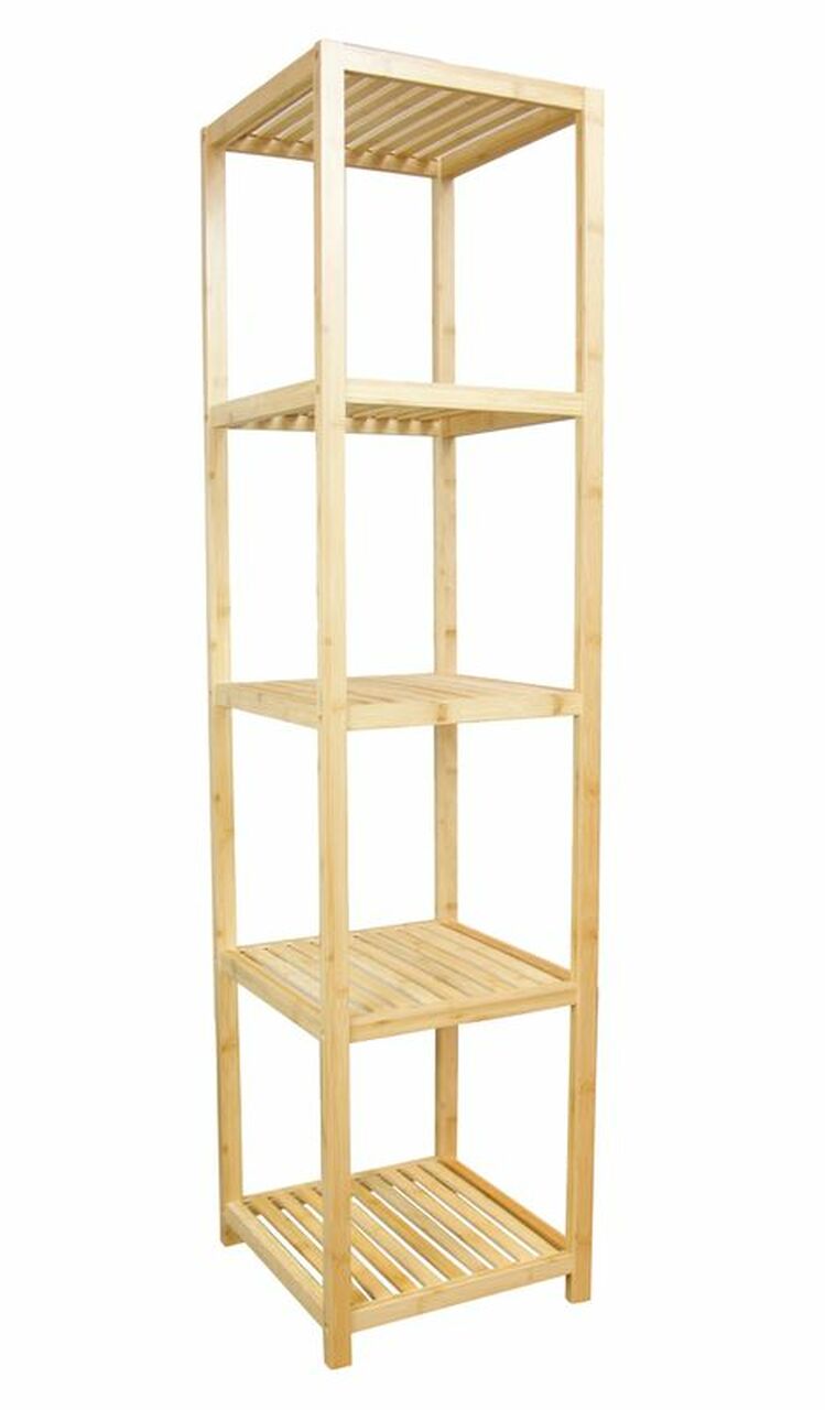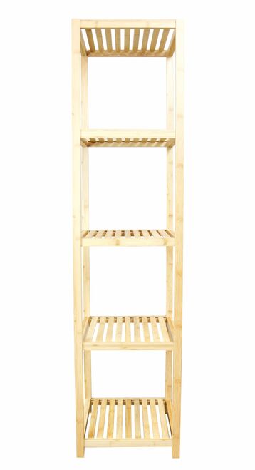 This 5-tier slatted solid bamboo tower shelf is the perfect storage solution for any small vertical space. You can trust that the sturdy, wet environment and eco-friendly bamboo construction makes it desirable for a variety of uses, without worry of water absorption or bacterial build-up. Ideal for every closet or bathroom and roomy enough to hold all your personal accessories, towels, tissue, linens, and beauty products. Expand your options and use as additional pantry storage, bookshelf, display or plant stand.