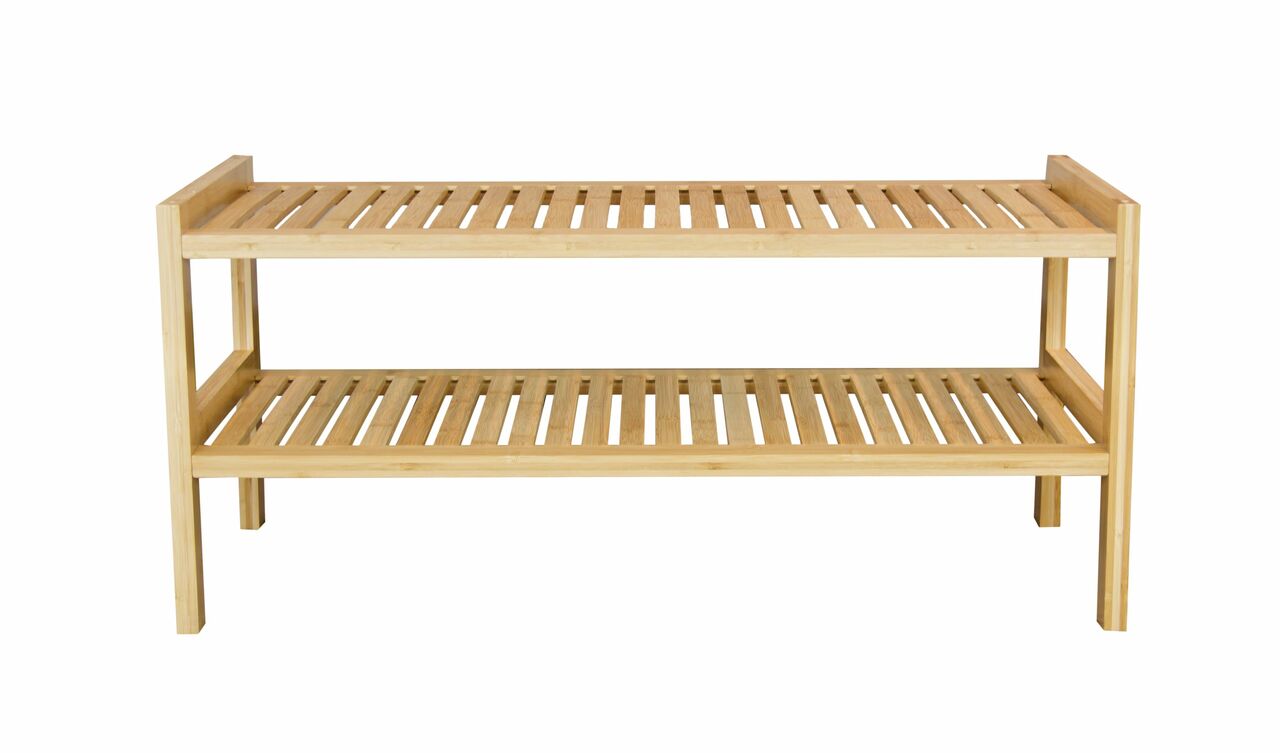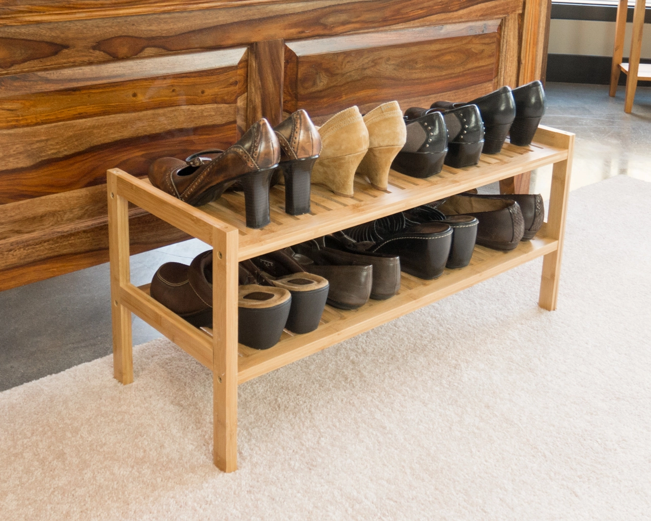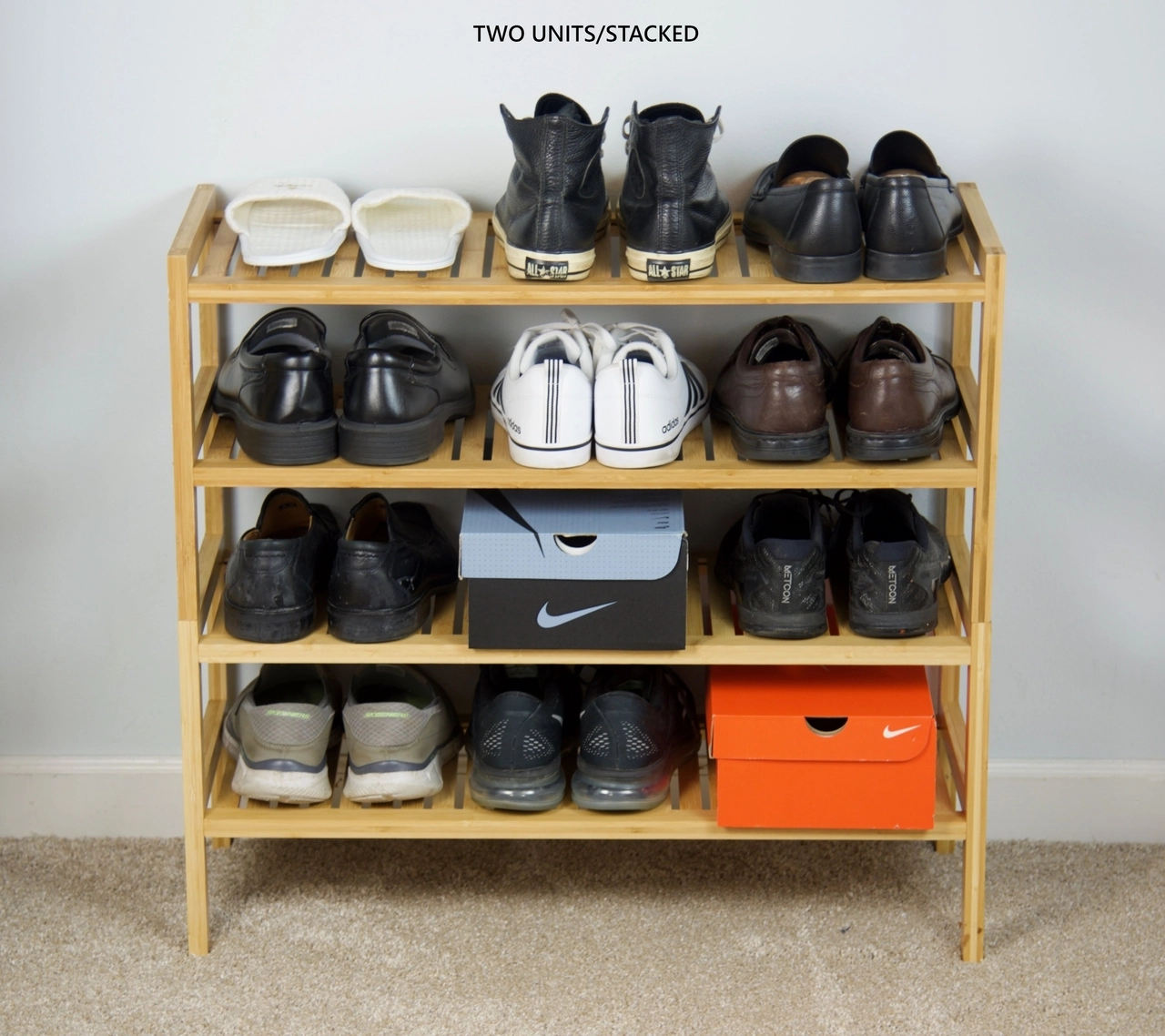 The solid bamboo 2-tier slatted stackable shelf is water-resistant and the perfect storage solution for any room in your home. Go vertical, amazingly stack up to five 2-tier shelving units together for all the shoes, towels, blankets, sweaters, linens, and accessory storage you need. Each 2-tier bamboo shelf comfortably holds at least 6 pairs of shoes with ease.