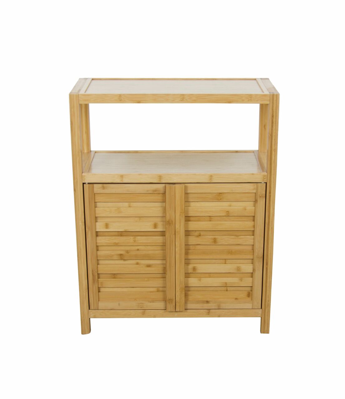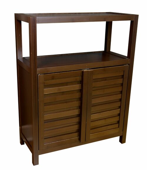 The Eccostyle sustainable bamboo spa style 2 door utility cabinet has a water-resistant finish and non-scuff footpads making it a perfect fit for wet environments. With two exterior shelves, and a dust free cabinet with an adjustable interior shelf, there is ample space for your towels, tissue, shampoo, and spa accessories. You can trust that the sturdy, eco-friendly bamboo construction makes it desirable for a variety of uses, without worry of water absorption or bacterial build-up. The ideal design and versatility for your shower, entryway, boudoir, or use as a stationary serving cabinet.